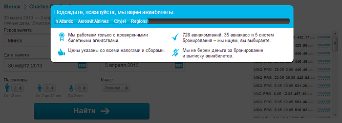 Большая зеленая кнопка «Найти» дает старт поиску билетов по предложениям 728 авиакомпаний мира.