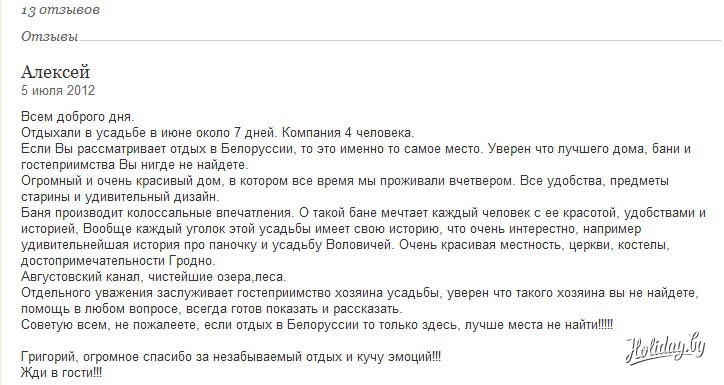 Из-за особой красоты природы, добродушия хозяев, прекрасной территории усадьбы и самого дома каждый об усадьбе «Ля Свяцка» у туристов остаются только положительные впечатления. Отзывы об отдыхе в усадьбе «Ля Свяцка» вы можете посмотреть здесь>>>