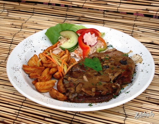 Далее идут, как всегда, блюда главного калибра из раздела «дары чешских лесов, вод и гор». Из них отмечу только те, на которые сам положил глаз: жаркое из судака с маслом и пряными травами с картофелем и петрушкой (200 г за 295 крон), стейк «Будейовицкий» из кабанятины, с печеным яблоком, брусникой и картофелем «фри» (200 г за 295 крон), фазаньи окорочки «по-охотничьи» с картофельным и шпиковым кнедликами и красной капустой (300 г за 222 кроны), ну и, конечно, большое, в 420 граммов, блюдо «Таборский деликатес» – свиной окорок, копченая грудинка, поджаренная кровяная колбаска с двумя видами тушеной капусты, тремя видами кнедликов и «Туплаком» пива (двухлитровая кружка!) впридачу за 333 кроны.
