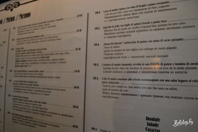 Ну, а теперь пробежимся по меню, которое на разных языках, в том числе и на русском, вывешено еще в холле при входе в ресторан. С первого взгляда очень даже приятный списочек и цифирки тоже божеские.