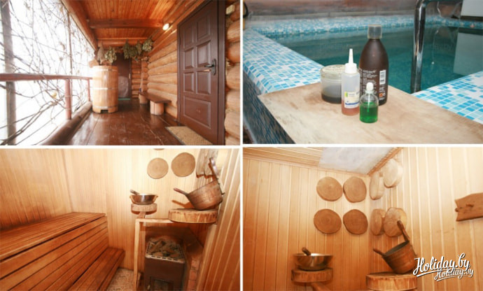 Настоящий банный комплекс встречает нас в усадьбе «Добра хата». Он соединил в себе все прелести СПА-отдыха и релакса. Русская парная на дровах, где на выбор предоставляются веники, хорошо и уютно обустроена. В стоимость аренды бани включены простыни, полотенца, тапочки, джакузи, бассейн-купель, бассейн на террасе. Отдохнуть после парной можно на улице в беседке с барбекю или более традиционно, в комнате отдыха. Сюда можно отправиться целой компанией – вместимость бани – 14 человек.