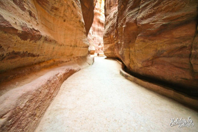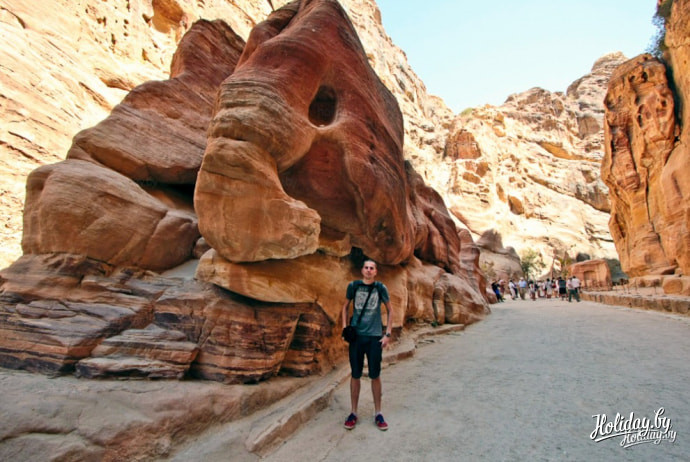 Дорога к центральной площади древнего горда занимает около получаса и вот, в самом конце ущелья открывается потрясающий вид на самое знаменитое сооружение Петры - Эль-Хазна. Величественный памятник древности вырублен в цельной скале и имеет высоту около 42 метров.