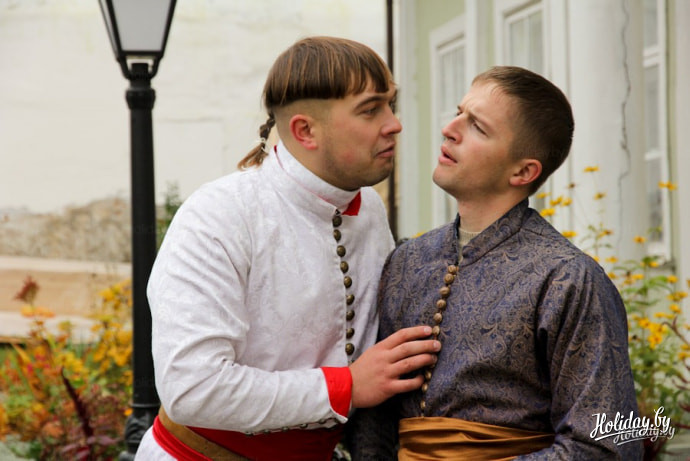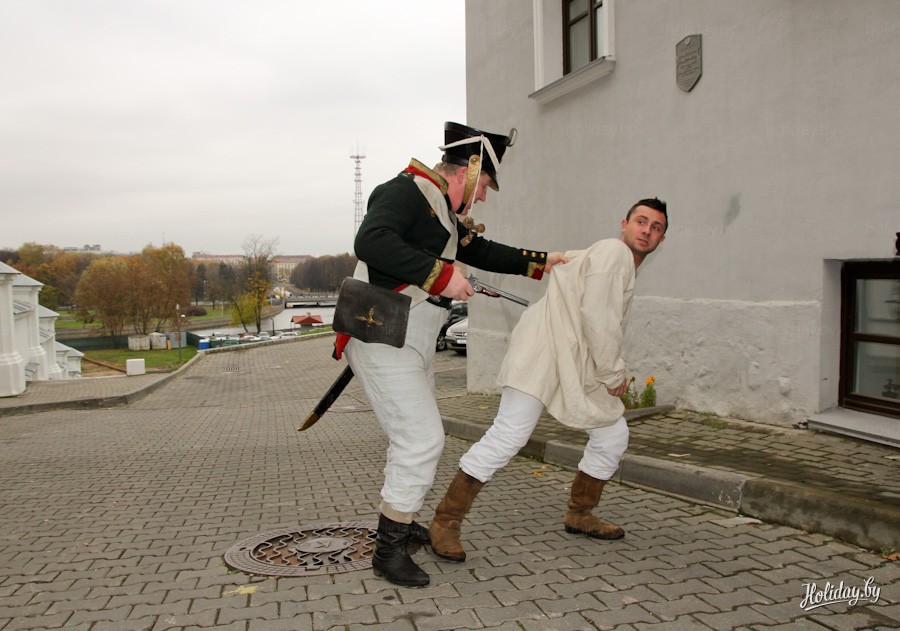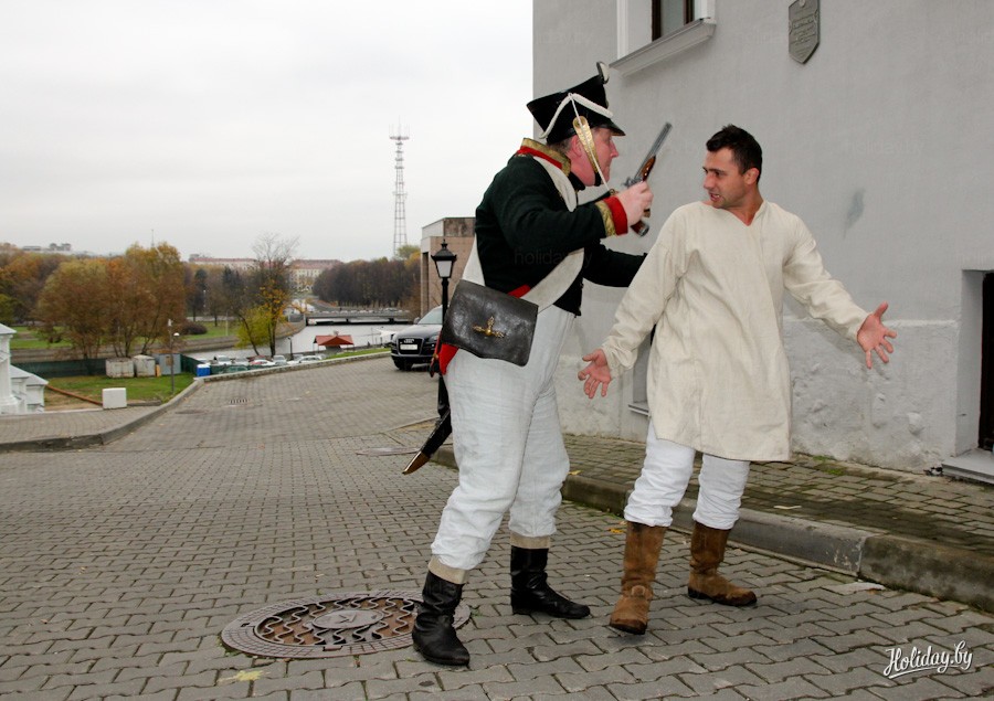Возле знаменитого Дома масонов предполагаемого масона страж порядка ведёт в тюрьму. Конечно, никто так и не доказал, что дом действительно принадлежал минской масонской ложе, но предположение такое есть. Масонская ложа в Минске просуществовала до 1822 года, пока решением царского правительства ее и запретили. Театральное действо показывает события того года.