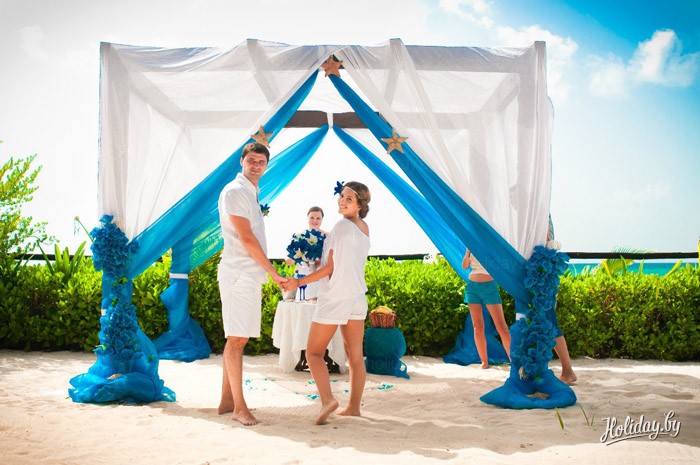 | Свадебная церемония "Волшебный бриз | $700 (Доплата за гостей по $50 за человека) | Вас ждет романтическая церемония бракосочетания на пляже у самого моря, русская ведущая церемонии, вручение сертификатов, веселые развлечения и конечно профессиональная фотосессия. Трансфер отель-пляж-отель; Ведущая церемонии; Декор (цветы, шары, столик для церемоний, арка и пр.); Букет невесты и бутоньерка для жениха из живых цветов; Шампанское 1 бутылка; Корзинка фруктов; Профессиональная фотосессия (150-200 фотографий) |
