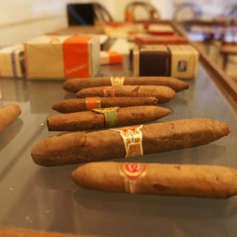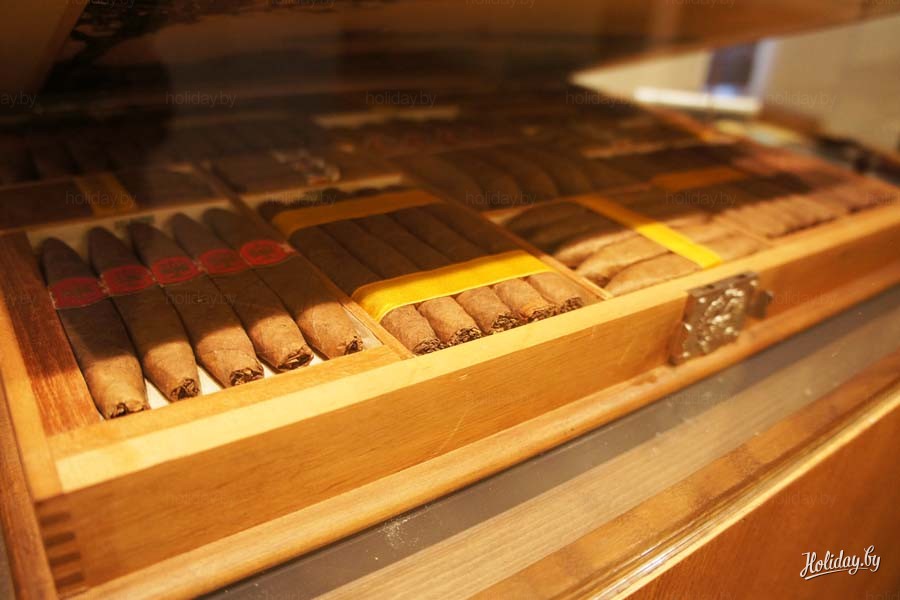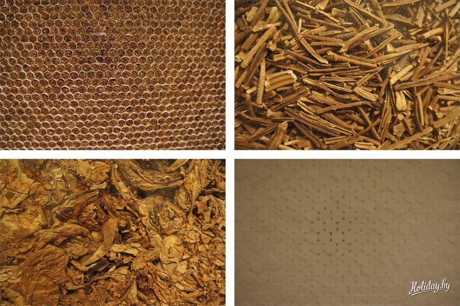 Очень красиво и необычно смотрятся витрины, заполненные листьями табака, фильтрами и художественно выложенными сигаретами: