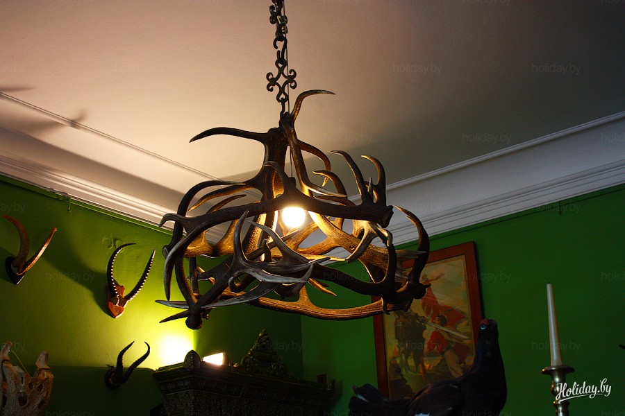 В охотничьем зале собрана коллекция различного оружия, шкур, рогов животных и даже предметы интерьера из них.