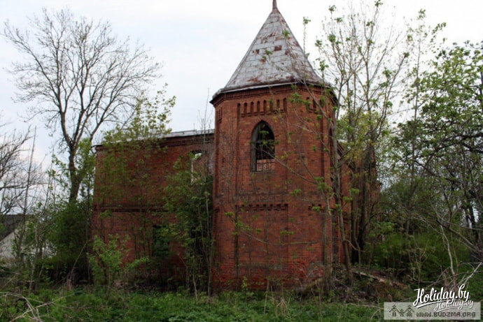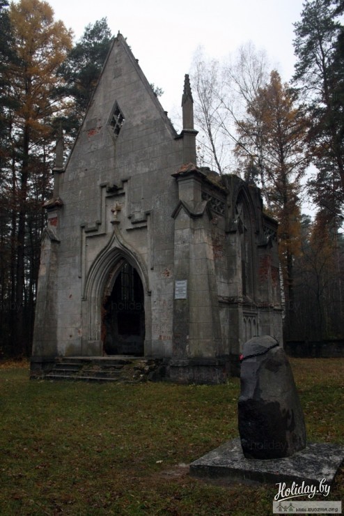 — Там осталась одна из самых живописных в Беларуси усыпальниц. Сегодня она в неплохом состоянии, но требует реставрации. Стоит на опушке, недалеко от самой усадьбы. Вековые деревья и огромная усыпальница в ретроспективно-готическом стиле делают это место особенно возвышенным. Не будем селить нашего цмока в саму усыпальницу, но сидеть где-то рядом в лесу и охранять её он бы мог.