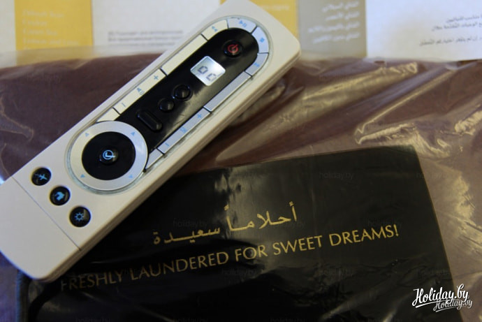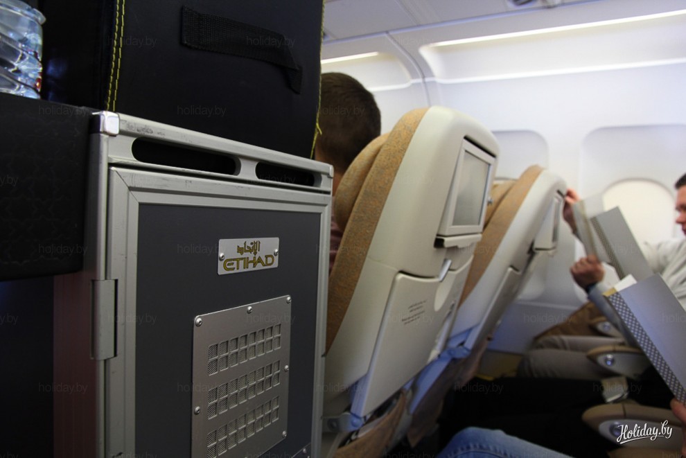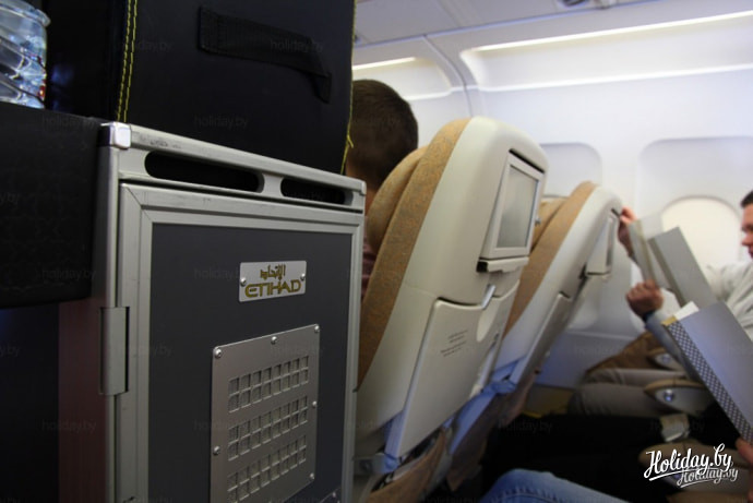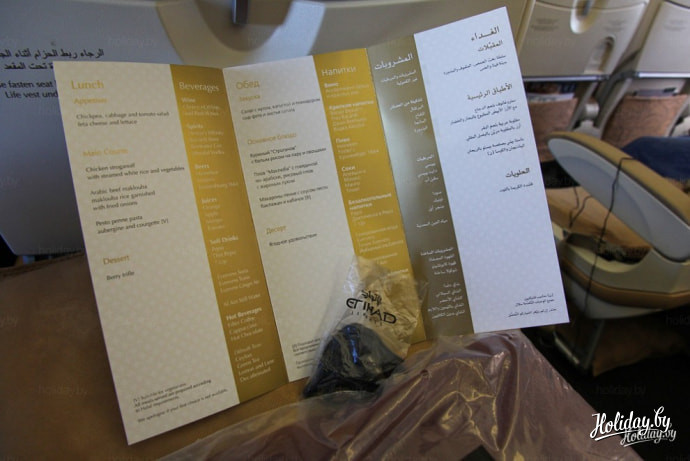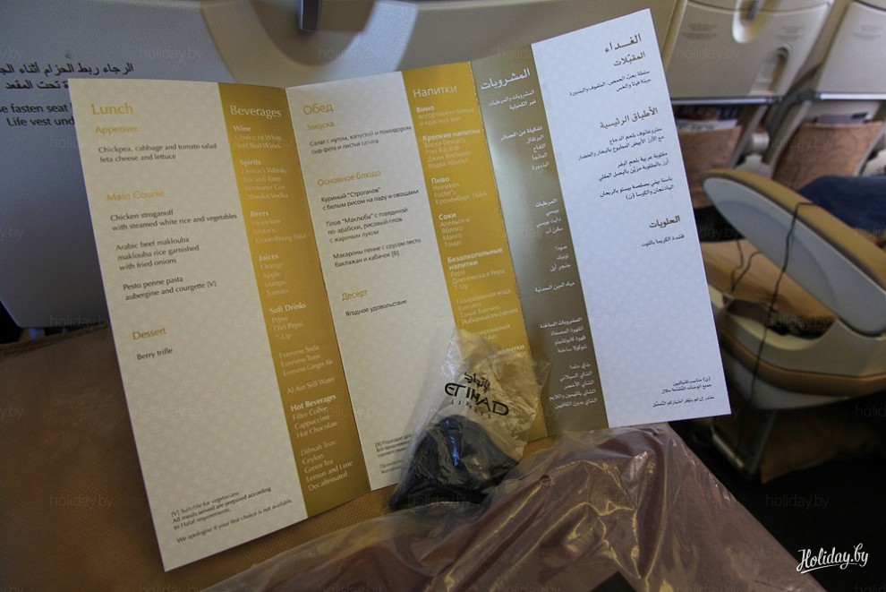 В стандартный набор гостя, путешествующего Etihad Airways эконом-классом, входят подушка под спину (или голову - как кому удобно), плед, одноразовые или многоразовые наушники, подборка прессы на английском языке, включая бортовой журнал и каталог покупок на борту. К этому набору сразу после взлета присоединяется меню для выбора горячего и ознакомления с тем, чем будут потчевать.