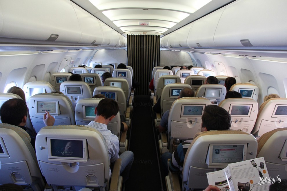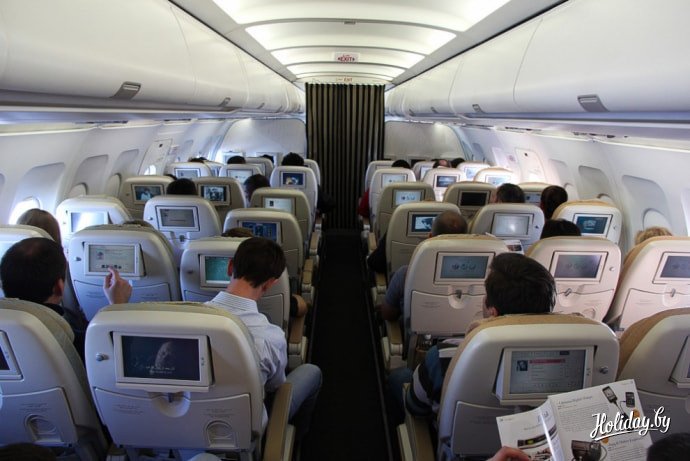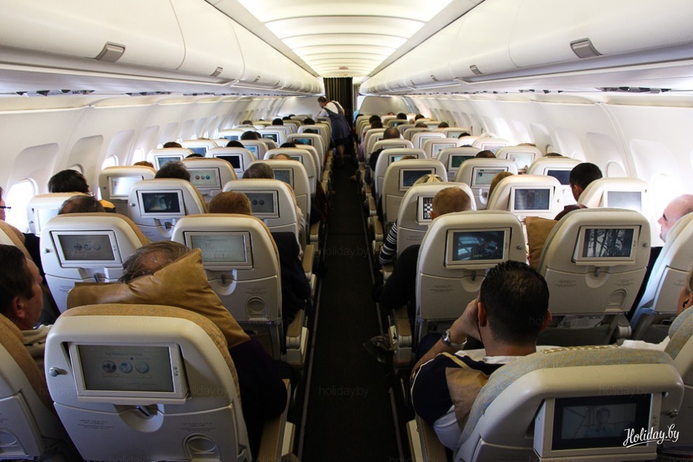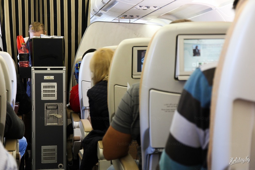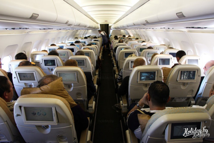 Салон эконом-класса Airbus Industrie A319 на рейсе Etihad Airways Минск-Дели до Абу-Даби.