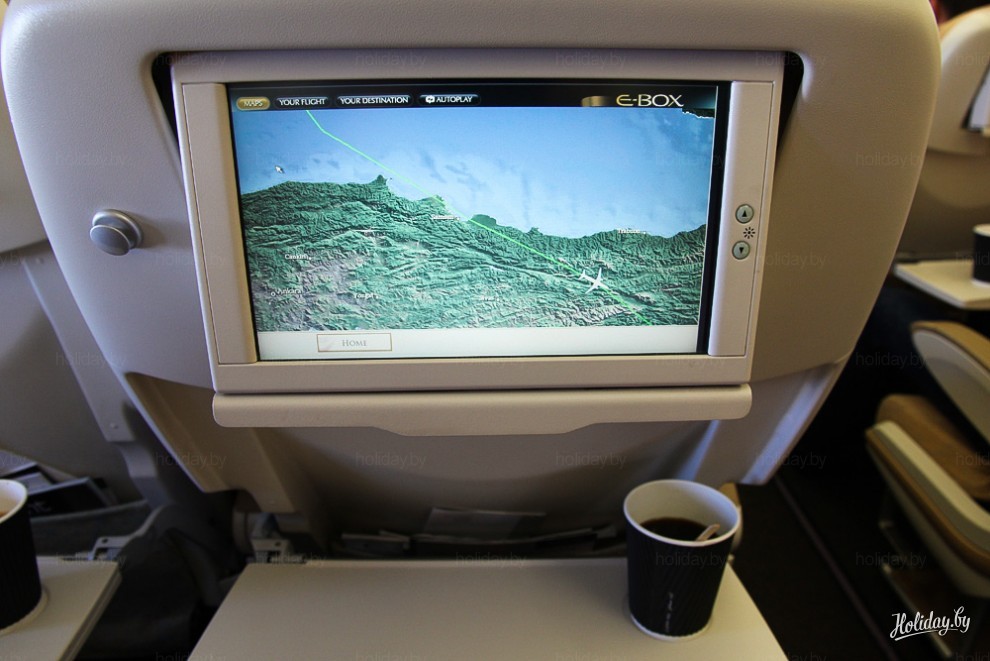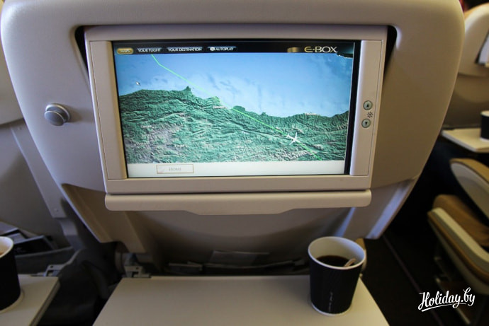 Расстояние между креслами увеличено, за счет чего всем пассажирам комфортно вне зависимости от желаний - лететь сидя или же максимально разложить спинку. Радует, что в случае последнего положения у впереди сидящего пассажира ваш столик сохраняет уверенное горизонтальное положение. Также продуман поворот экрана мультимедиа-системы по вертикали, дающий возможность комфортного просмотра вне зависимости от положения спинки.