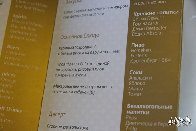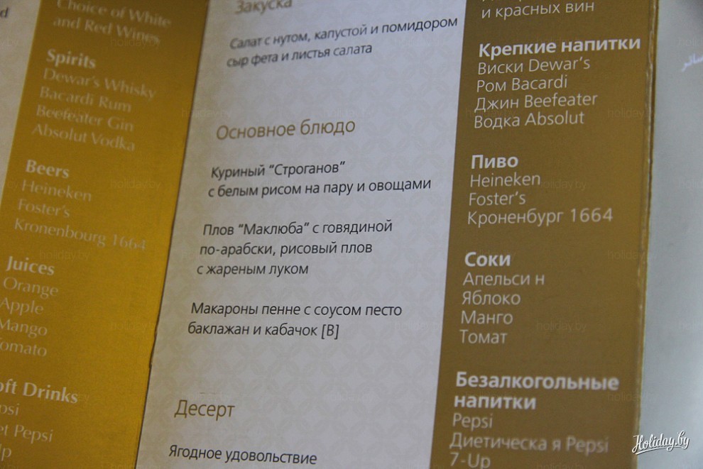 Безусловно, еда во время 6-часового перелета является немаловажным фактором, поэтому внимание пассажиров приковывается к меню. Гостям предлагается выбрать один из видов горячего. Радует широкий выбор напитков.