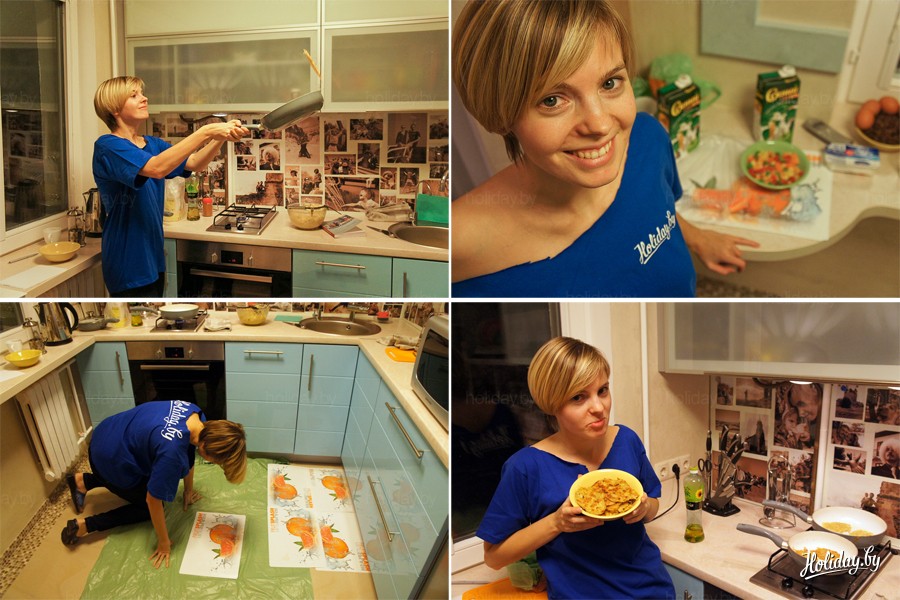 Оставшуюся картошку наш руководитель отдела по работе с клиентами Валентина Касинская решила превратить в драники! Кто, как не она, знает, что продается только красивый товар (и съедается тоже), а если добавить в процесс его создания элементы акробатики и жонглирования, то цены ему не будет. А если составляющее шоу-программы разлетается по всей кухне или прилипает к потолку, нужно делать большие-большие глаза и застенчиво улыбаться.