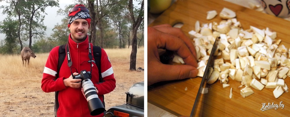 Например, в Индии коровы - священные животные, разрешена лишь фотоохота. Андрей настолько пропитался культурой и религией страны, что телятина отныне персона нон-грата на холидеевском столе (или персона, употребляющая телятину, становится нон-грата... в нюансы мы решили не вникать), поэтому зразы будут с грибами.