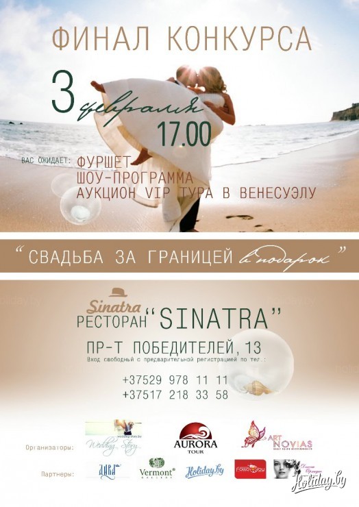 Свадебный портал Wedding Story, туристическая компания Аврора-Тур и творческая студия ArtNovias ещё в ноябре прошлого года объявили о начале конкурса «Свадьба за границей в подарок». Будущие молодожены в течение почти двух месяцев присылали заявки на участие в конкурсе, чтобы побороться за главный приз – организация свадебной церемонии в любой стране мира! К главному призу прилагается и множество других, не менее приятных подарков и сюрпризов от партнеров проекта.