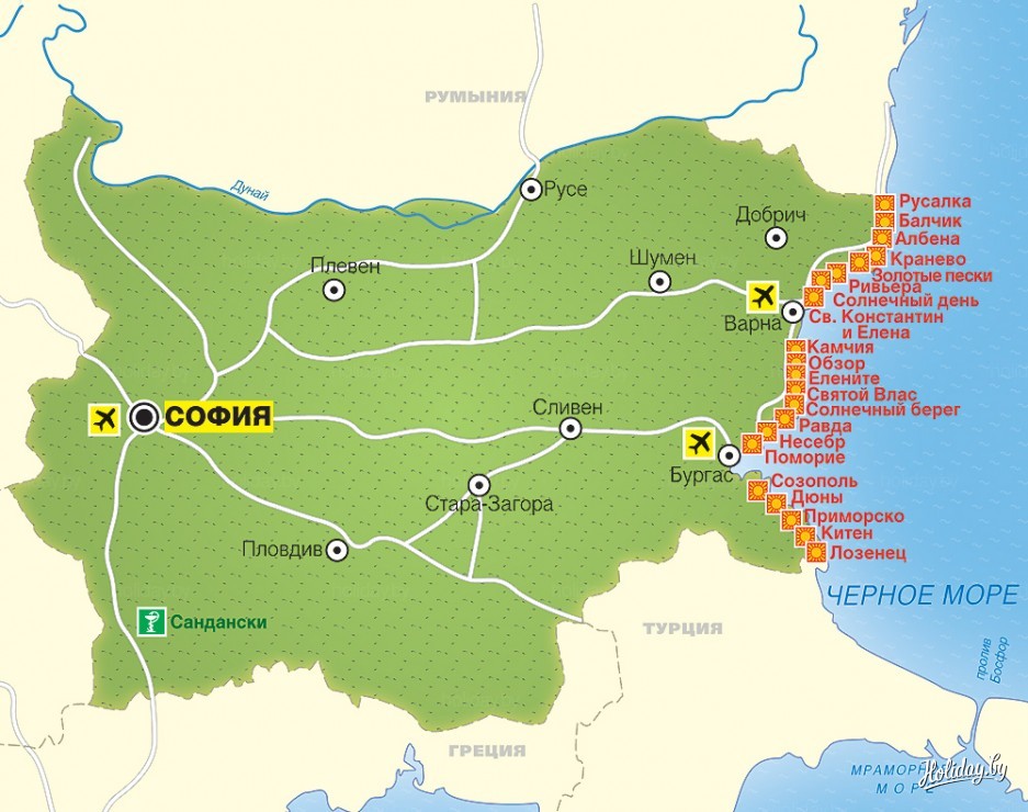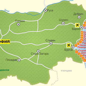 Благодаря географическому положению страны, туристическая карта курортов Болгарии достаточно проста – все морские пляжные курорты вытянулись с севера на юг вдоль побережья Черного моря. Среди них – всем известные Золотые пески, Балчик, Кранево, Святой Влас и множество других мест.
