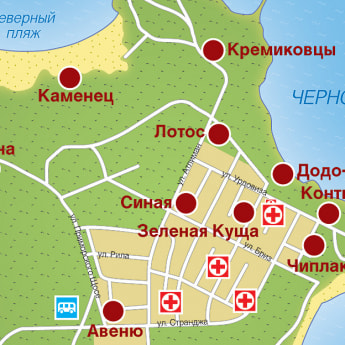 В Китене около двадцати отелей, которые расположены в самых разных местах курорта. Некоторые из них (например, Орбита, Каменец, Марина, Рилена) расположены максимально близко к пляжам, практически на берегу моря. Другие же (Авеню, Лотос и т.д.) расположены в центре города, поближе к инфраструктуре.