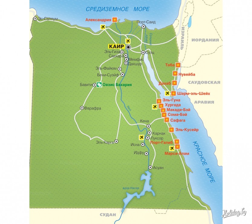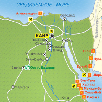 Туристическая карта курортов Египта насыщена уже известными и популярными местами для отдыха – Хургада, Шарм-эль-Шейх, Нувейба, Сафага и многие другие места всегда готовы принять туристов. Основная масса курортов расположены на востоке страны и вытянута вдоль Красного моря. Впрочем, на побережье Средиземного моря туристов ждут Александрия, Эс Саллум и Порт-Саид (и другие небольшие курорты и поселения).