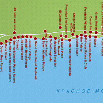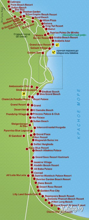 На городской карте Хургады выделено 4 района, имеющих разную историю и роль в жизни курорта: