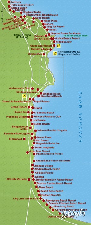 Благодаря огромной популярности курорта, в Хургаде находится более двухсот отелей – все они вытянуты вдоль береговой линии Красного моря. Основная часть отелей расположена на первой береговой линии – это означает, что постояльцы смогут посещать собственные пляжи, очень чистые и максимально приспособленные для туристов. Некоторая часть отелей располагается на некотором отдалении от побережья, в районе Старого города – эти места для поселения могут выбирать поклонники экскурсий и прогулок по историческим местам.