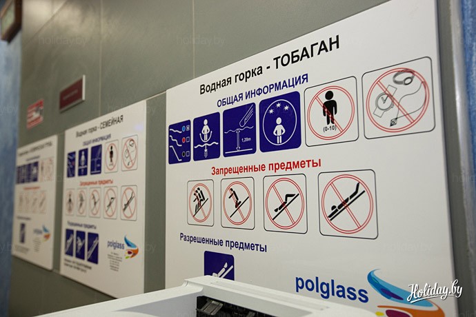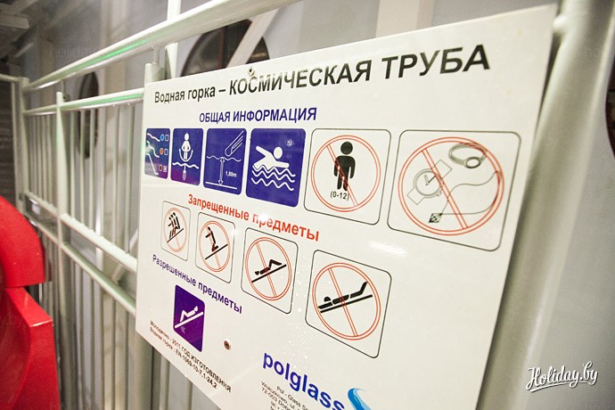К слову, как вы уже заметили на фото, возле каждого аттракциона есть специальный «паспорт», где указаны глубина воды в месте «вылета» из трубы, допустимый возраст посетителя и положения, съезжать в который опасно для жизни. Однако экстремалы все равно находятся – на наших глазах многие вскакивали в трубу и вперед головой, и сидя, и вдвоем, как заправские бобслеисты. На самом деле это может грозить серьезной травмой. За безопасностью в аквапарке постоянно следят два инструктора, но за всем, как известно, не уследишь. То, что не увидят инструкторы, зафиксируют камеры, установленные по периметру аквапарка.