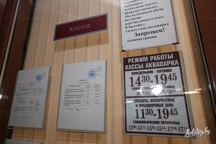 Время работы аквапарка в Молодечно: с понедельника по пятницу с 15.00 до 21.00, в выходные с 12.00 до 21.00. Однако администратор предупредила, что в субботу попасть в аквапарк довольно проблематично – зачастую все билеты бронируются заранее, причем, в основном, минчанами. Все вопросы можно уточнить по телефону (0176) 70-77-78.