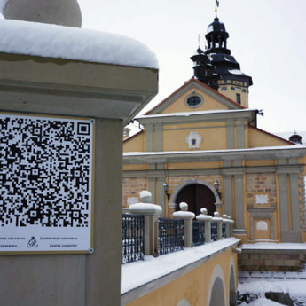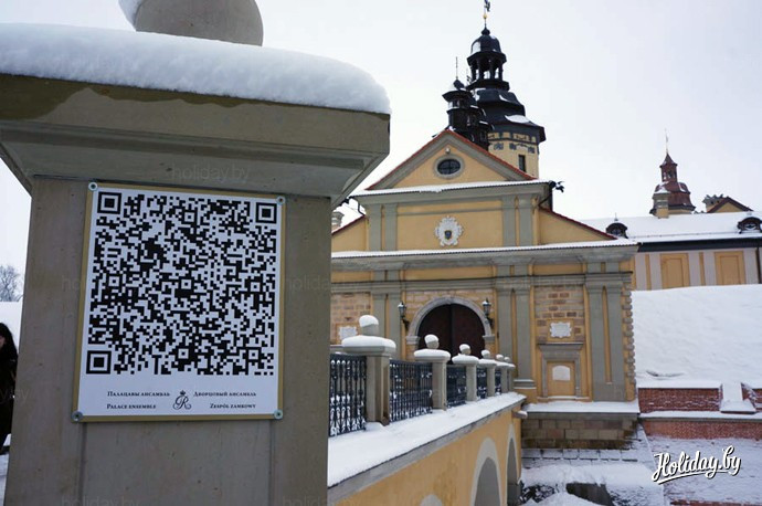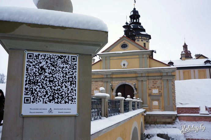 На входе в резиденцию Радзивиллов порадовало наличие большого QR-кода. Он размещен на видном и удобном месте. Несвиж одним из первых в стране взялся обеспечивать свои культурно-исторические объекты инновационными технологиями QR-кодирования.