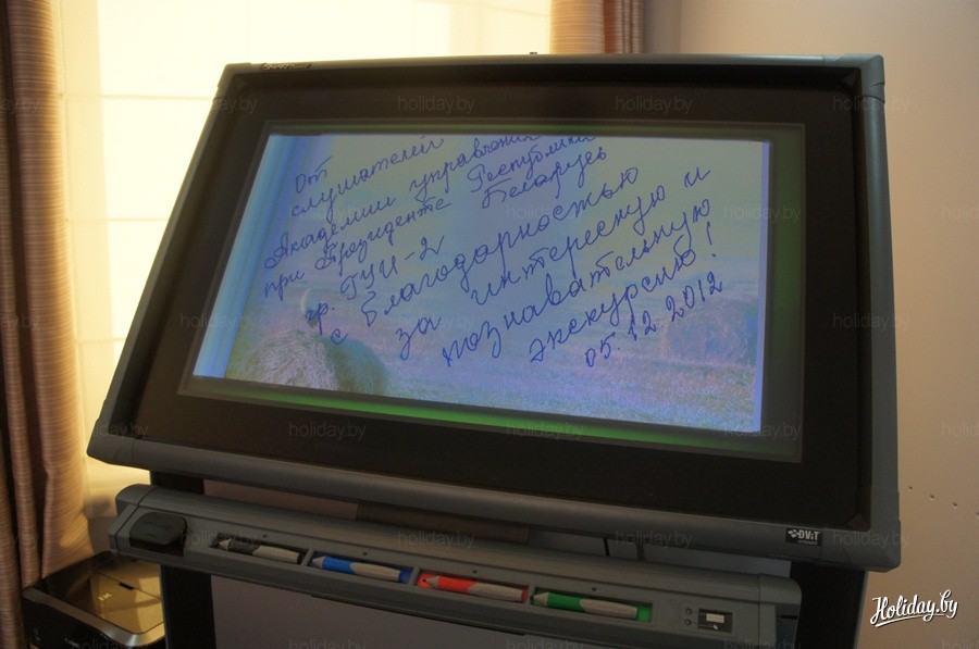 Стоит отметить, что в музее внедрены современные мультимедийные технологии. Однако, как нам пришлось убедиться, вся информация в тех же инфокиосках представлена исключительно на русском языке. Как нам объяснили хранители музея, к его созданию была привлечена российская фирма, поэтому все материалы загружены на русском языке. Сейчас ведется работа по переводу информации на белорусский и английский языки, однако это займет много времени. Ведь материалов, представленных здесь, хватит на 23 часа непрерывного прослушивания и изучения.