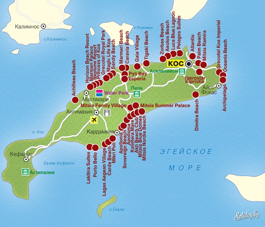 Курорт Кардамена, расположенный в южной части острова, является вторым по величине на Косе. Это место туристы особенно любят за необыкновенную насыщенную ночную жизнь. Кстати, именно из Кардамены удобнее всего добраться на Нисирос, чтобы осмотреть действующий вулкан. На северном побережье Коса нахоядтся Мастихари, Тигаки и Мармари – отличный тандем курортов с длинными пляжами и аквапарками.
