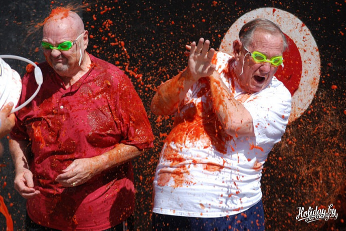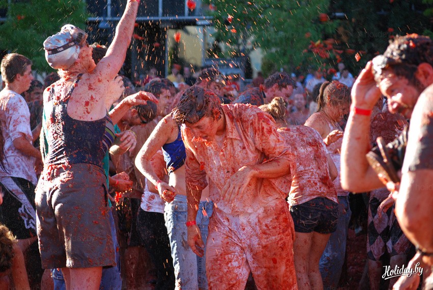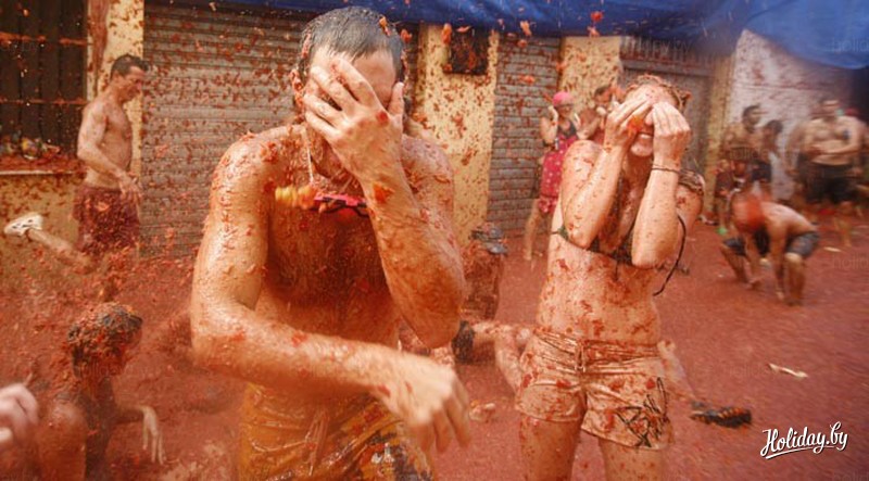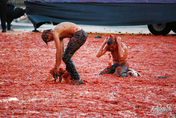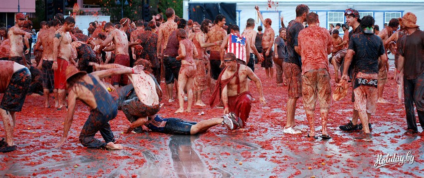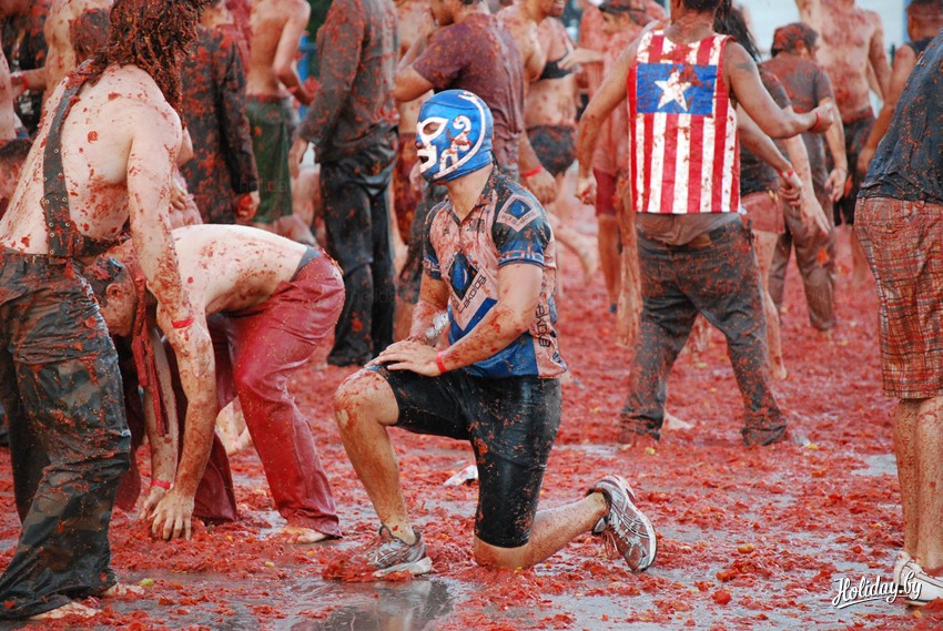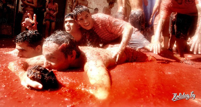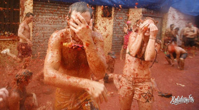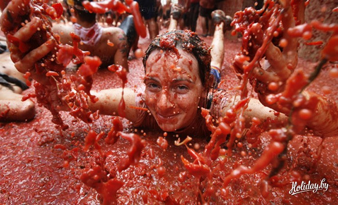 Каждый год последнюю неделю августа в Испании проводится недельный фестиваль томатов. В этой дружественной войне коварным оружием являются помидоры. Приезжие из десятков стран смеются и веселятся, окунаясь в реки томатного сока.