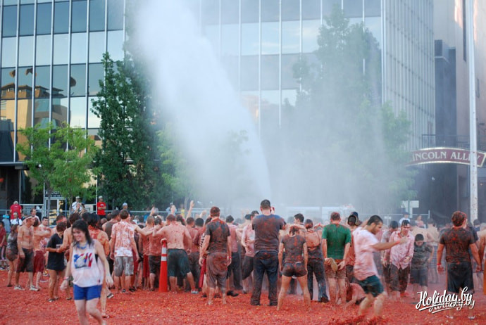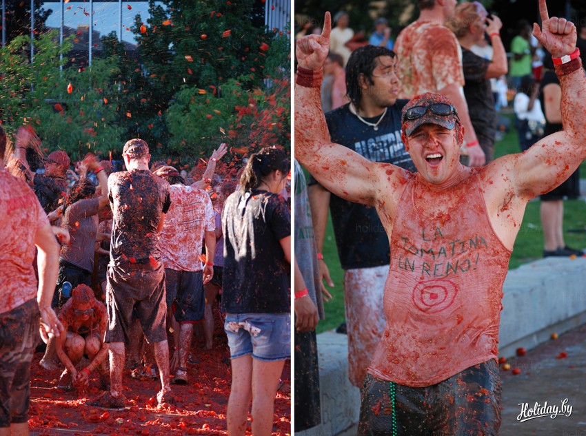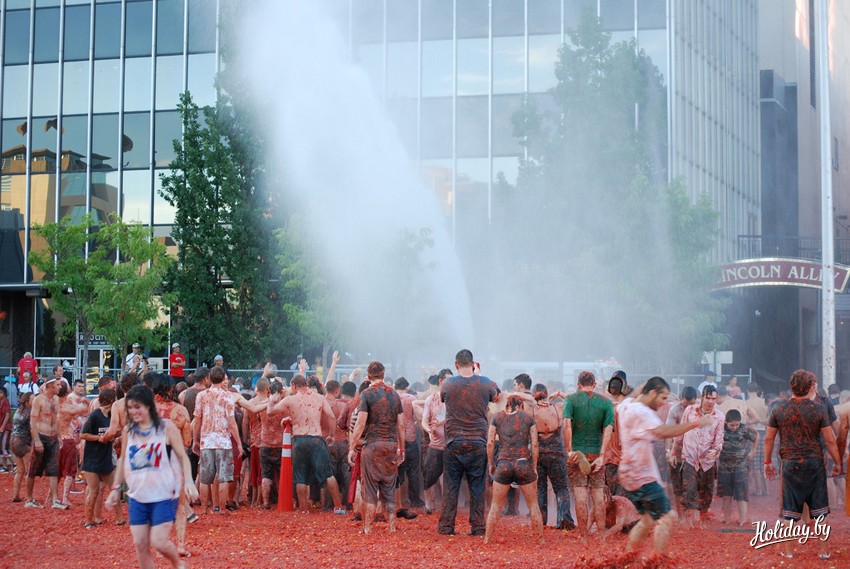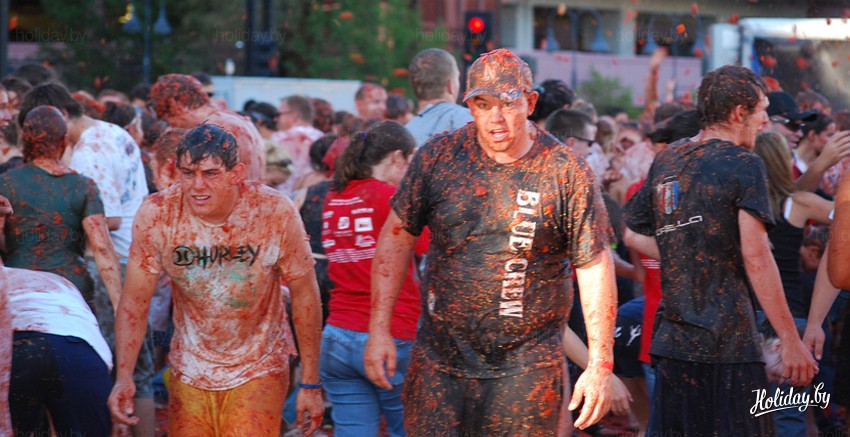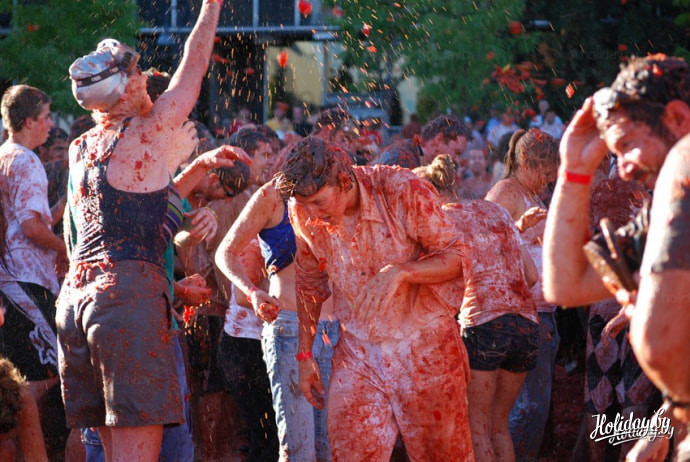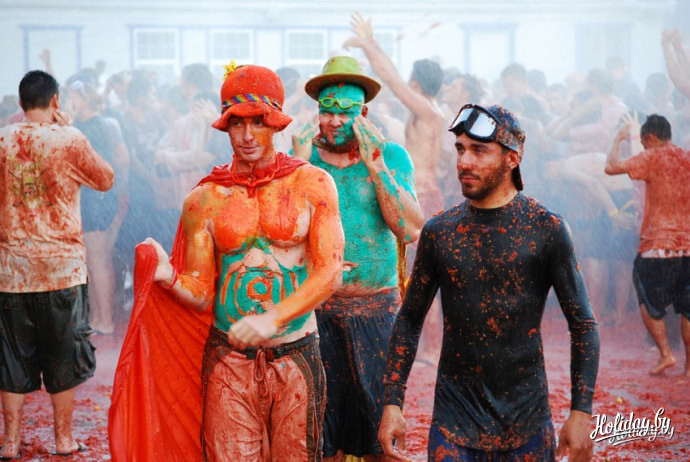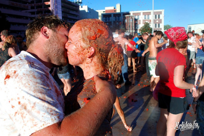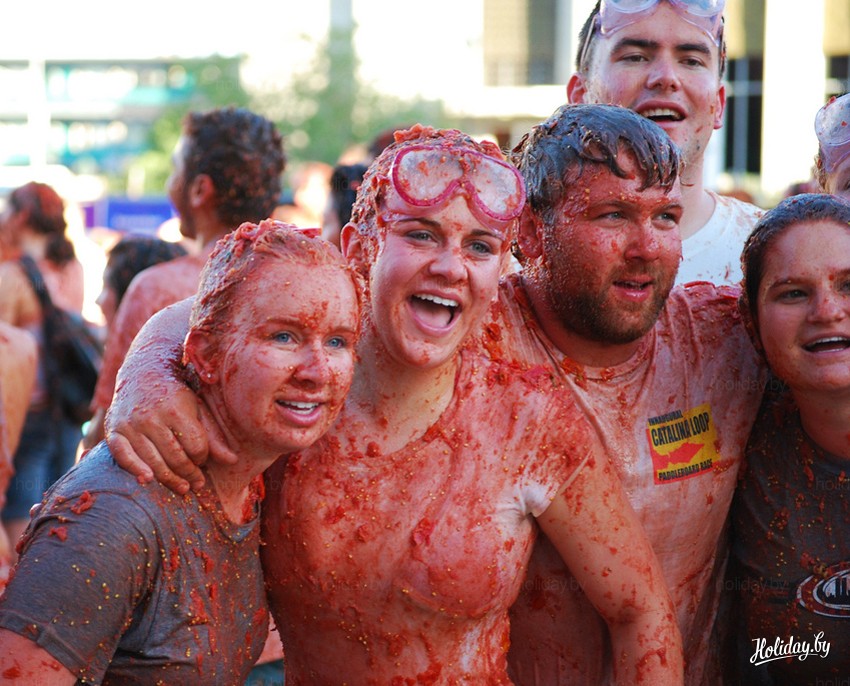 Каждый год последнюю неделю августа в Испании проводится недельный фестиваль томатов. В этой дружественной войне коварным оружием являются помидоры. Приезжие из десятков стран смеются и веселятся, окунаясь в реки томатного сока.