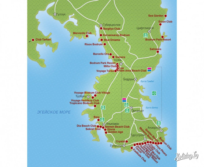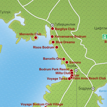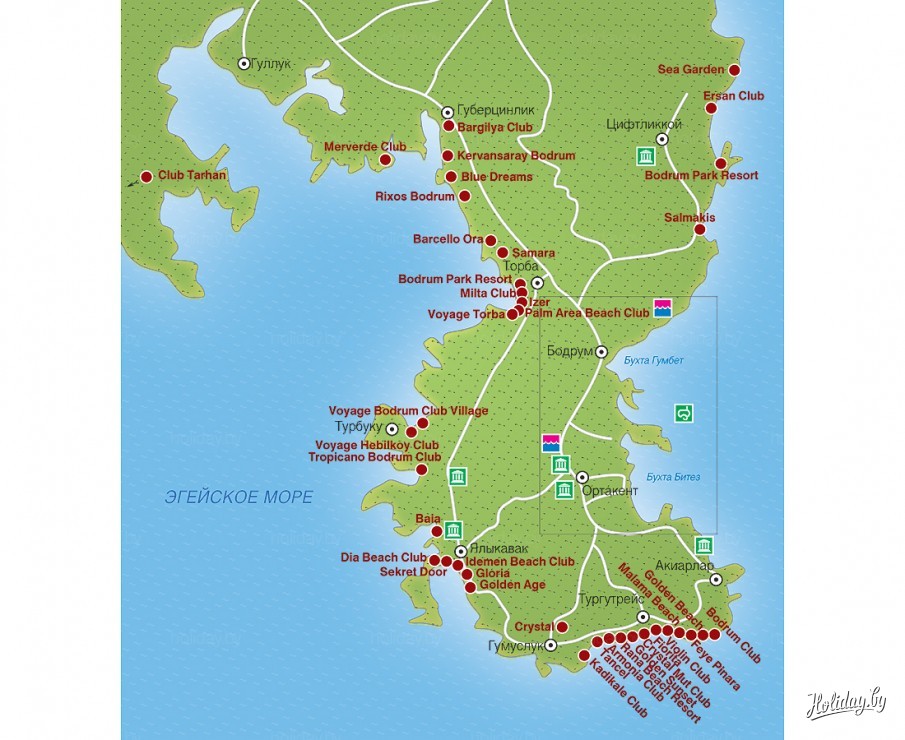На территории региона Бодрум выделяют несколько курортов – Цифтликкой, Губерцинлик, собственно, Бодрум, Ялыкавак, Гумуслук и другие. Вокруг этих точек на карте сгруппированы собственные отели, пляжи, инфраструктура.