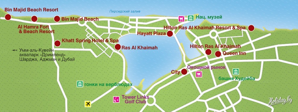 Город-курорт Рас-эль-Хайма не слишком часто упоминается в туристических путеводителях или предлагается как направление отдыха в Арабских Эмиратах. Отсутствие популярности является абсолютно незаслуженным, поскольку этот курорт, растянувшийся по побережью Персидского залива, обладает приятным климатом, потрясающими пейзажами и абсолютно всеми условиями для комфортного отдыха. Залив разделил Рас-эль-Хайма на две соединенные мостом части – западную и восточную. Одна из них является просто кладезью достопримечательностей, а в другой располагается собственный аэропорт эмирата, что сильно упрощает путь на курорт. Кстати, одна из приятных для туристов особенностей эмирата Рас-эль-Хайма – здесь нет сухого закона (в отличие от всего ОАЭ).