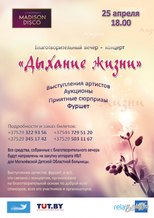 Благотворительный вечер-концерт «Дыхание жизни» состоится при поддержке «Магавиа-Сервис» 25 апреля в клубе Madison. Главной целью организаторы ставят сбор средств на покупку аппаратов искусственной вентиляции легких для Могилевской Областной Детской Больницы. Там лежат дети, которые не могут дышать самостоятельно. Они лежат в реанимации и не могут увидеть своих родителей - доступ туда есть только у врачей. Для того чтобы дети могли продолжать жить и развиваться, необходимы портативные аппараты искусственной вентиляции легких и специально оборудованные помещения для детей, где они смогут быть рядом с родителями.