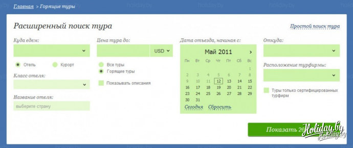 Расширенный поиск тура предлагает больше критериев поиска. Вы можете конкретизировать место отдыха определенным курортом или отелем. Если вас интересуют только горящие предложения, можете ограничить поиск исключительно этим разделом. Также при выборе тура вы можете ориентироваться на месторасположение офиса компании и город вылета или выезда. И наконец, можно просмотреть предложения исключительно сертифицированных турфирм. (Подробнее о сертификации турфирм и что это значит для туриста можно прочитать здесь).