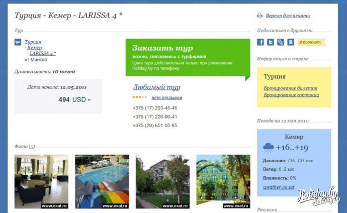Каждый авиа-тур (в Турцию, Болгарию, Египет, Грецию и т.д.) содержит описание и фотографии отеля.