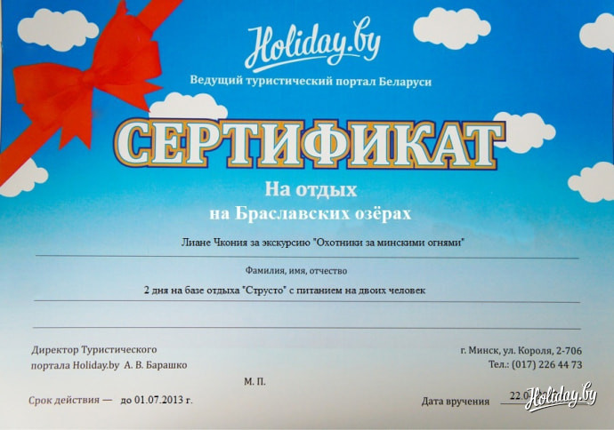 И с лёгкой руки нашего главного редактора подарок достался Лиане Чкония за экскурсию «Охотники за минскими огнями». Так как портал мы туристический, то и подарок у нас соответствующий: 2 дня на базе отдыха «Струсто» на Браславских озёрах на двоих человек! Как выяснилось, Лиана уже второй год проводит эту экскурсию в рамках Фэста экскурсоводов. И хоть экскурсия учебная (Лиана пока не профессиональный экскурсовод), но стоит того, чтоб посетить её!