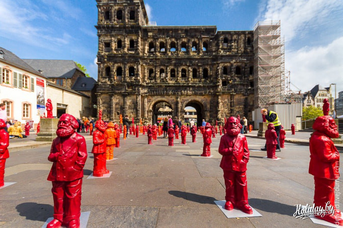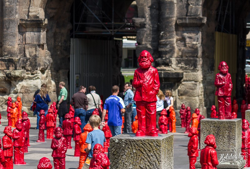 В воскресенье, 5 мая, центр самого старого города Германии Трира, который находится почти на границе с Люксембургом, подвергся нашествию пяти сотен бородатых коммунистов! Красные оккупировали площадь перед Черными воротами, равномерно рассредоточившись по ней. Если присмотреться, то в каждом красном можно узнать… Карла Маркса!