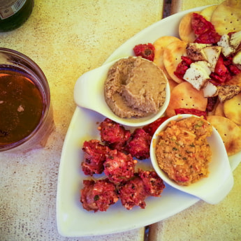 Традиционная закуска перед основными блюжами - колбаски, несколько видов паштетов, сушеные томаты и крекеры