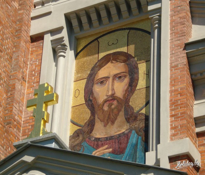 Уже издалека привлекает внимание необычное панно, украшающее фасад здания часовни. Особенность и даже уникальность данной мозаики заключается в том, что в каком бы месте человек не находился перед часовней, глаза Иисуса всегда будут смотреть на него.