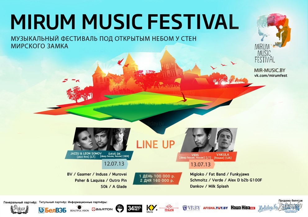 Прошлый год показал, что у «Mirum Music Festival» есть все задатки для того, чтобы стать событием международного уровня, а это значит, что летом 2013-го года мы сделаем еще несколько уверенных шагов в этом направлении. Будет значительно расширен состав участников, в который войдут не только локальные таланты, но и замечательные зарубежные исполнители и диджеи, каждый из которых достоин отдельного крупного события. Принять участие в фестивале с удовольствием согласились музыканты из Литвы, Германии, Украины и России, что неудивительно, ведь место его проведения – живописнейшая поляна, расположенная прямо напротив культурной и исторической ценности Беларуси – Мирского замка.