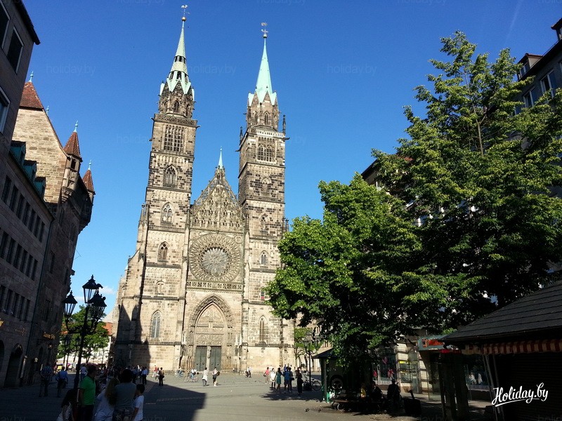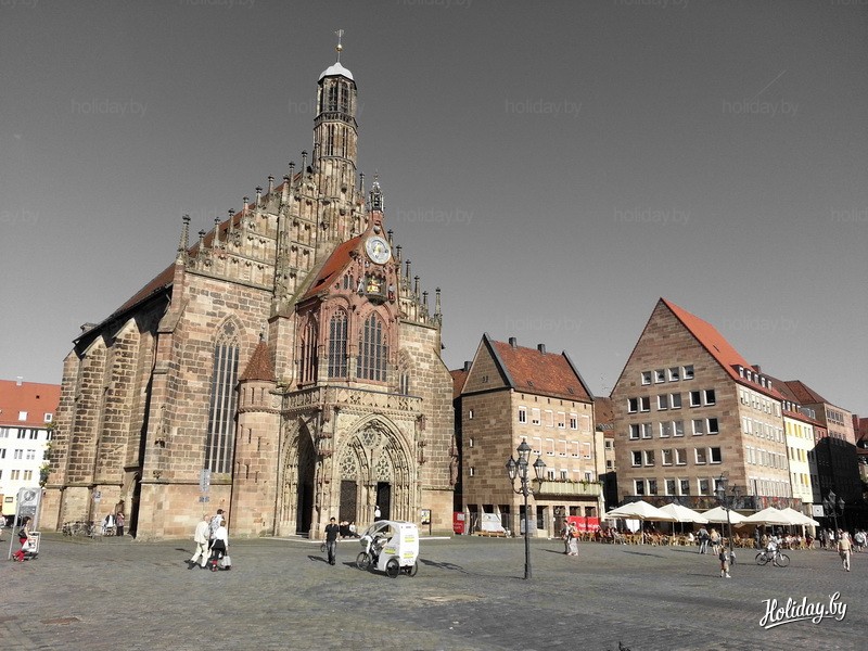 Католическая церковь Фрауэнкирхе на рыночной площади Нюрнберга (Hauptmarkts). Построена на месте разрушенной в 1349 году во время еврейского погрома синагоги.