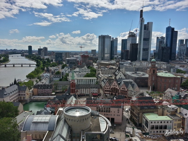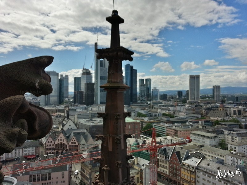 За 3 евро можно подняться на башню собора Святого Варфоломея - готического символа Франкфурта. Справа видна церковь Святого Павла, которая считается национальным памятником Германии. Тут с 1848 по 1849 год заседали члены первого демократически избранного парламента страны. Здания с зубчатыми фронтонами в середине - ратуша (район Рёмер)