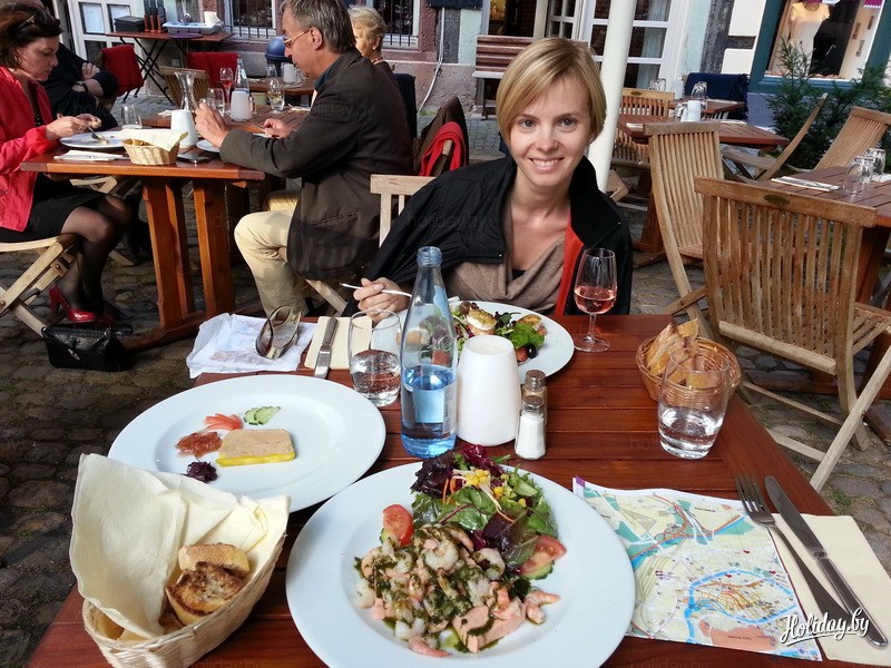 Никакой визит во Францию немыслим без вина, свежего хлеба, фуа-гра и подобных изысков местной кухни. Ужин во дворике Страсбурга.
