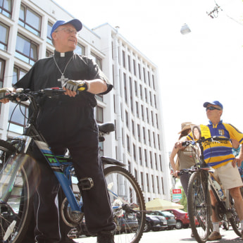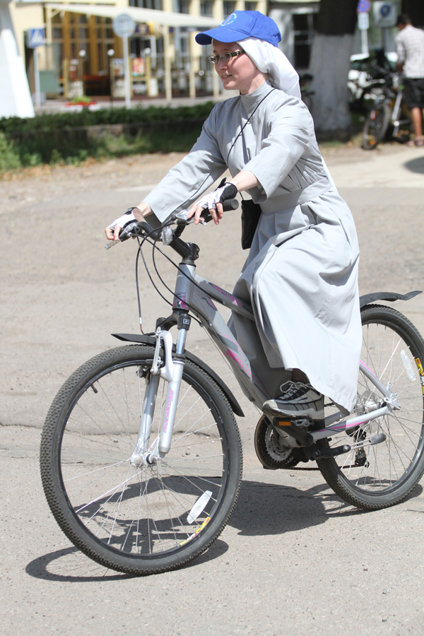 От Костела Святых Симеона и Елены в Минске около сорока пилигримов во главе Митрополита Тадеуша Кондрусевича на велосипедах отправились в Будслав. Самому молодому участнику велосипедной пилигримки - 14, а старшему - 58 лет.