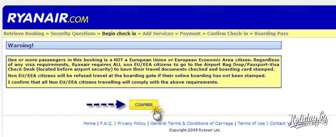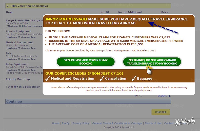 Шаг 8. Не пугаемся опять (многие предложения сделаны в виде системных предупреждений - авт.). Здесь авиакомпания спрашивает у вас, есть ли соответствующая страховка, отвечающая требованиям путешествия. И буквально сразу же предлагает их собственную Ryanair Travel Insurance. Думается, что нужно позаботиться о страховке на весь период путешествия в принципе в белорусской страховой компании, а тут нажать "Нет спасибо..." как показано на картинке.