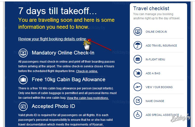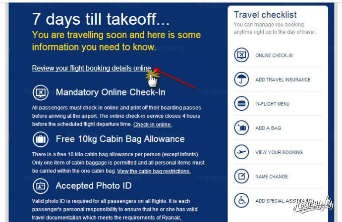 Пример письма на электронную почту за неделю до вылета. В каждом письме миллион раз повторяется норматив багажа и тут же предлагается перейти к платным сервисам - заказать еду в полете, заказать дополнительный багаж. Как мы писали раньше, заказ багажа является хорошей затеей, если вы путешествуете группой. Почему? Читайте, как выглядит рейс Ryanair.