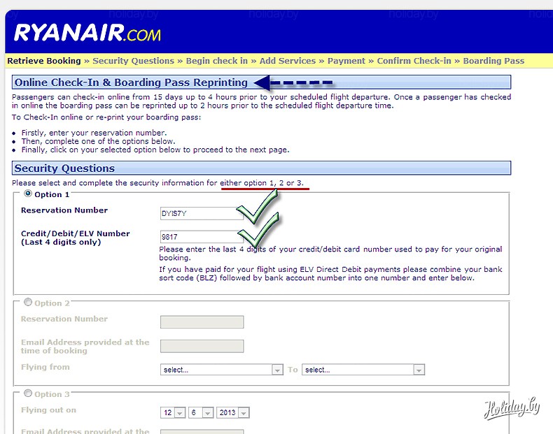 Шаг 2. Мы находимся на пути к онлайн-регистрации и печати посадочного талона. Распечатка для неграждан ЕС обязательна, так как в аэропорту вы будете обязаны поставить visa check на эту распечатку (см. ниже). На этом шаге выбирается способ регистрации в зависимости от того. как был осуществлен платеж за билет - в нашем случае это пластиковая карточка. Для этого "радио-кнопку" надо поставить на поле Option 1. После этого вносим номер резервации (из мэйла) и последние четыре цифры карточки.