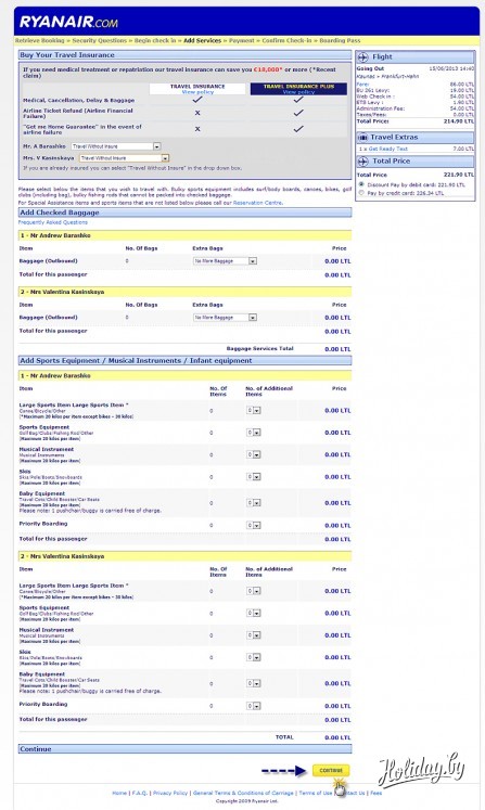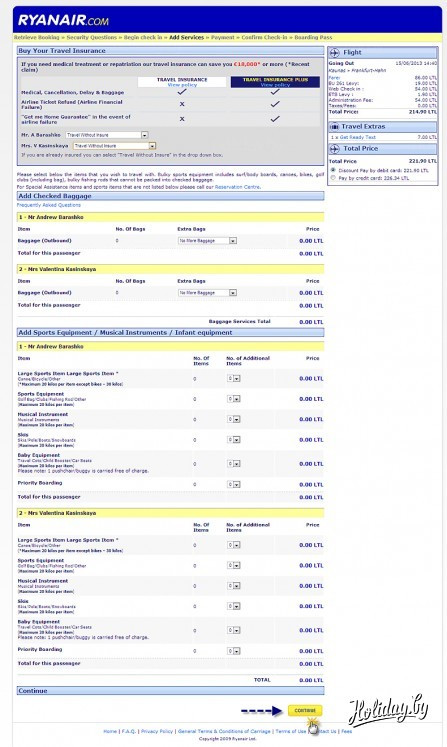 Шаг 7. И ещё раз "здравствуйте" на предмет, не желаете ли чего-нибудь дополнительно приобрести. На этом шаге предлагается купить дополнительное багажное место. На случай горнолыжного или другого спортивного оборудования, детские коляски - отдельные поля. Обратите внимание на Priority bording - это покупка права первыми пройти регистрацию на рейс и выбежать на лётное поле. Но надо понимать - в спину могут дышать ушлые "бюджетнички". Если эти позиции не про вас - оставляйте их как есть и жмите "Продолжить" (Continue)