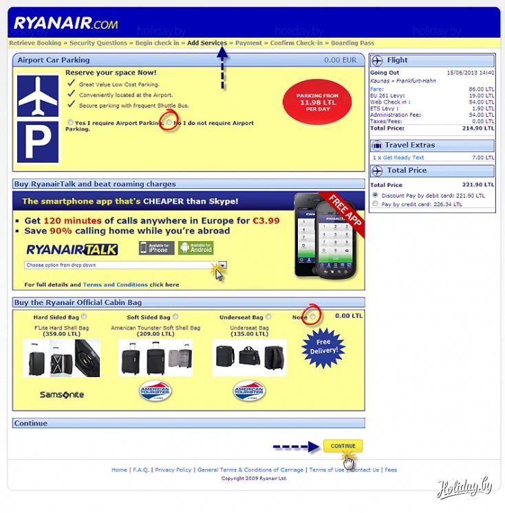 Шаг 9. Хитрый ход от авиакомпании, которая не теряет надежды продать вам ну хоть что-нибудь. На этом шаге вы видите некое подобие интернет-магазина. Для того, чтобы не купить платную парковку, какую-то непонятную очень полезную программу для смартфона, фирменный чемодан и пр., надо везде либо выбрать кнопкой, либо в выпадающем меню около каждой позиции выбрать "Нет, спасибо...". После этого жмём на "Продолжить" (Continue)