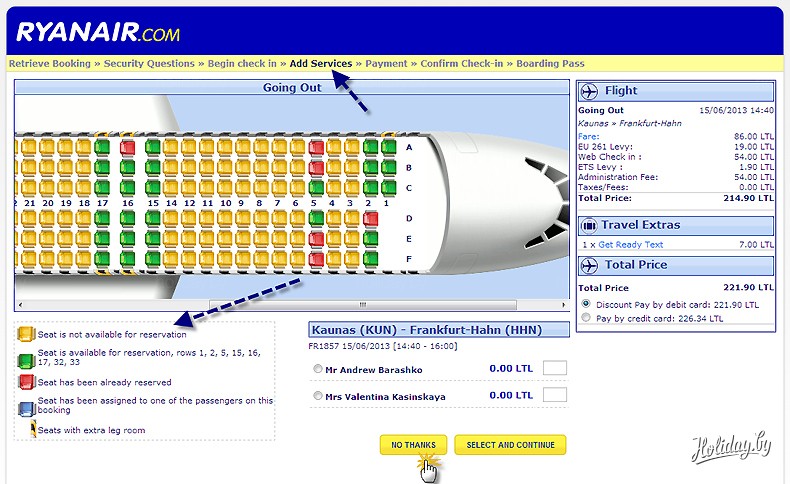 Шаг 6. Add services предлагает нам (навязчиво или нет - судить вам!) купить конкретные места в самолете. Если вы не уверены в скорости ног и месте в очереди на посадку, можно прибегнуть к платной услуге. На схеме зеленым обозначены места, доступные для онлайн-бронирования. Кстати, обратите внимание, что за "чек-ин" вы уже заплатили (табличка справа - авт.). Никуда от этого не уйти :) Если платные кресла вас не интересуют - жмём "Нет, спасибо" (No thanks)